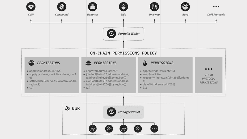 Our typical workflow is to collaborate with partners to define the assets, protocols and chains through which funds will be managed. This helps to identify the specific permissions needed for the desired management, and to group them into tailored “onchain permissions policies”. The partner’s portfolio account then grants the relevant permissions to kpk’s manager account, allowing us to prepare, submit and execute the permitted actions.